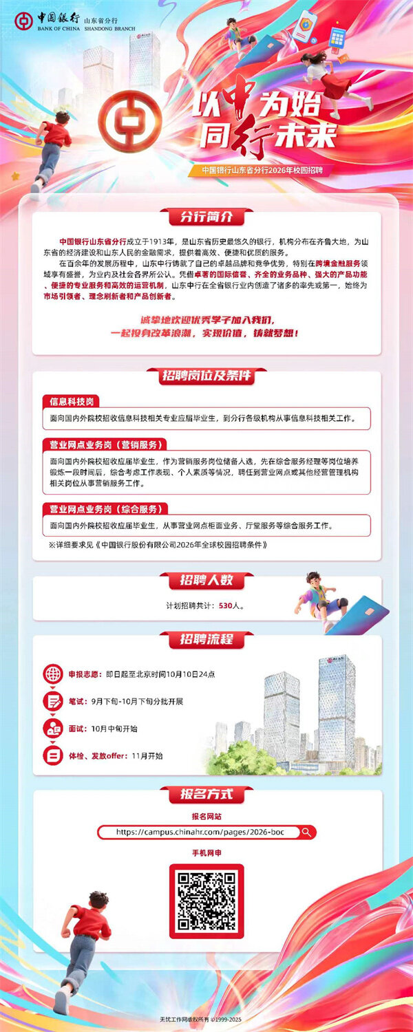 中国银行山东省分行2026年校园招聘开始啦